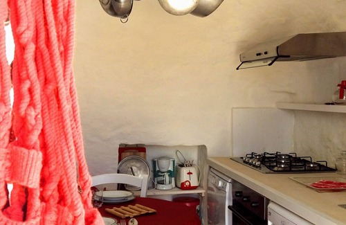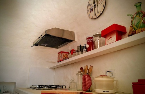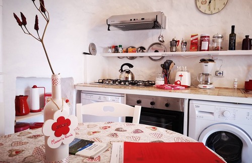 The romantic holiday home with wifi in trulli has an independent entrance and is distant from the other accommodations. It consists of a living room and equipped kitchen (5-burner stove, oven and microwave, toaster, dishwasher, fridge with freezer, washing machine), bedroom with wardrobe and double bed and bathroom. Heating. An outdoor area is available to the apartment to be used as a relaxation area or for eating out.