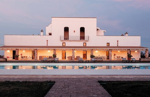 Masseria Samali is a large, converted 16th-century farmhouse near the coast, within easy reach of Porto Cesareo. Featuring a 20-metre pool and ample space for up to fourteen guests, it is ideal for a large gathering of friends or family. Carefully restored to preserve its historical features and updated for modern comfort, the villa offers seven air-conditioned bedrooms and generous indoor and outdoor living and dining areas, including a spacious covered portico large covered porch equipped for relaxing and dining al fresco and a panoramic first floor terrace. The interior showcases traditional Puglian design, with vaulted ceilings, original stone, and whitewashed walls. Set within a vast agricultural estate, the property offers seclusion and easy access to Salento’s countryside, beaches, and cultural attractions.