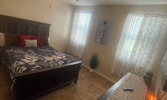 You’re home away from home in El Paso Tx with 1 lovely Master bedroom featuring a queen bed. This charming house offers a fitness space, WiFi, karaoke and a cozy shared living room and kitchen. Enjoy the soothing bathtub and shower in the bathroom and a majestic walking closet for yourself. Enjoy your morning coffee or evening steak on the grill at our beautiful backyard. We look forward to hosting you at our place.