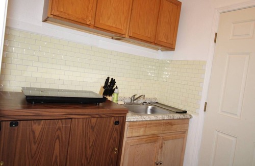 Includes a stove, microwave, sink, mini-fridge, coffee maker, and all the basics for a quick breakfast or a simple home-cooked meal.