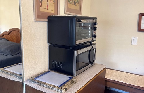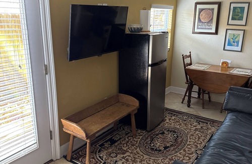 This is our master suite located off the laundry room. Private entrance from the side of the home, access to the laundry room with a locked door for your privacy. Recent update with full sized refrigerator/freezer . 1 King bedroom, full couch, flat screen Roku tv, WiFi, table for 2-3, private walk in shower, jacuzzi tub, double vanity. Onsite parking, central AC and heat controlled by you. Kitchenette has coffee pot, toaster oven that toasts, bakes, broil and microwave. 2 drawer stand dishes, cooking utensils, silverware, cups & glasses for you comfort. Condiments include coffee. You have access to 2 outdoor sitting areas. There is a large walk in closet for pet kennels and pets are welcome with a $25 pet fee. Backyard is fenced. We provide beach chairs, umbrella, coolers & beach blanket. We have 2 EV charging stations: 1 level 1 and 1 Level 2 fast charger that is 5 amp. We charge a minimal fee for use during your stay.