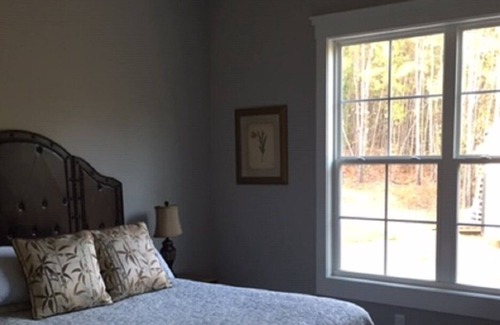 Beautiful 2 year old county home. Surrounded by woods, 2 spacious bedrooms, 2 bath and large open floor plan. 2 Queen blowup mattresses are available at house and plenty of open floor plan to set up. Two large porches for outside living. Back porch has large tv, grill, table and chairs, perfect for relaxing. Front porch has chairs, rocking chairs and large porch swing. Large kitchen island with 4 chairs and dining room table that seats 8.