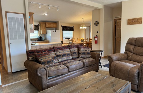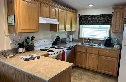 This lovely country home is a perfect option for a small group. It features an open living, kitchen, and dining area which allows guests to remain together even if in different areas. The kids can watch a game while others prepare a meal in the kitchen. Enjoy a cup of coffee on the front deck while others remain snuggled on the living room couch as the morning gets started. There is a 50" Smart TV in the living for your enjoyment. The kitchen is well stocked with all the kitchen gadgets, gizmos, and utensils you could need while on vacation. Once the meal is made there is plenty of room in the dining area or you can enjoy the sights and sounds of nature with a meal outside on the new side porch.