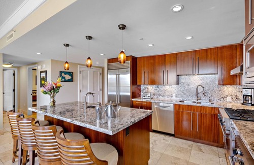 This remarkable retreat features a harmonious blend of modern comforts and elegant aesthetics. With two fully equipped kitchens boasting stainless steel appliances and beautiful granite countertops, you can host memorable meals or cater your wedding celebration with ease. Each of the three master bedrooms features sumptuous king-sized beds, while additional guest accommodations ensure ample sleeping arrangements for your loved ones. The property includes four lavish bathrooms designed for relaxation, and the generous outdoor balcony space is perfect for soaking in the warm Maui sun as you toast to your forever after.