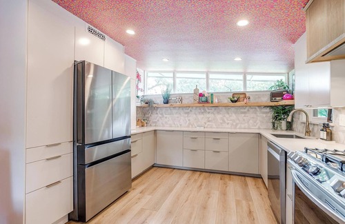 Welcome to LOOK UP! Only 5 mi from AT&T + Globe Life + in the center of all DFW hot spots, you’ll find it to be the perfect location! Guests are encouraged to “look up” at Jesus + wallpaper/art on every ceiling. 4bed/3bath home features a chef’s kitchen, saltwater pool, resort style backyard, poolside Casita & 2 patios. This house was designed for bachelorette trips, girls’ getaways & family gatherings!