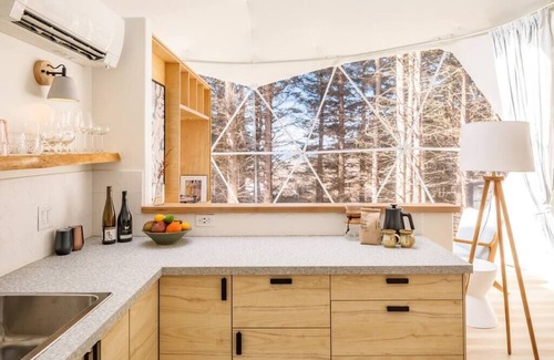 Nestled in the woods of PEI’s south-eastern shore, and overlooking the Murray Islands is the Maytree Eco-Dome, a unique 26ft all seasonluxury accommodation complete with a kitchen, bathroom, private bedroom, jacuzziand lounge with views of the water.