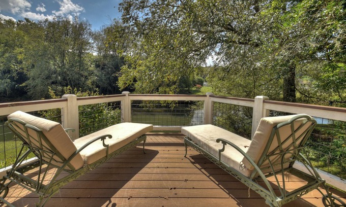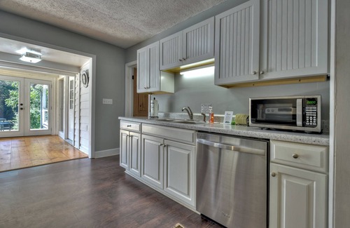 McCaysville River House is a rare find on the banks of the Toccoa River! This unique and newly remodeled river cottage has a front porch with wicker porch furniture, windows all around, the living room has a comfortable sleeper sofa, love seat, and 48” TV with cable. The house also boasts 2 King Bedrooms; all one level living! Outside the dining room is a large deck with an outside table, a wood-burning fireplace and lots of comfortable deck/lounge furniture right on the banks of the river.
