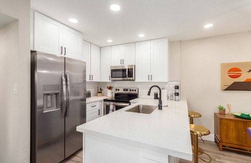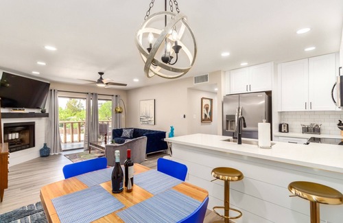 Super remodel in McCormick Ranch. 2nd floor with no one above you. Great views from the super sized patio to lush landscape. Parking ultra convenient with plenty of guest parking. Enter into a large great room open concept modern and wonderful living, dining and kitchen. The kitchen has white quartz, and a beautiful breakfast bar for entertaining or just socializing while meal prepping. It is fully stocked with everything you could possibly need, including a Nespresso coffee maker. The attached dining room has seating for 4 and can double as a workspace for your laptop etc. The living room is colorful and cozy with a fireplace and 65" Smartv with Hululive. Step out to the private balcony for outdoor dining or grilling on your electric BBQ. Just down the hall are two king bedrooms, one with an ensuite bath. Both have private televisions for enjoying the privacy in your own room. The hall bath and is just across from bedroom 2, so it is like having a private second bath. A full sized laundry room is in the is comfortable space too. There are 2 pools in the complex, heated with jacuzzis. Also tennis/pickleball courts. Private work out room with just enough equipment to get in a work out. The grounds are comfortable, well maintain and tree lined with grassy areas between. Walk to restaurants, coffee and even a brewery.
