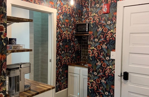 We named our place Remedies Inn in honor of the many family pharmacies that occupied the space since it’s birth in 1860’s. Soak in the history in your private suite. A king size bed in the private bedroom boasts a tempurpedic mattress with an extra thick mattress cover for comfort, a large antique dresser and a 50” smart TV. WiFi is complimentary. The living area features a kitchenette with fridge, microwave and coffee service, a sleeper sofa with 6" memory foam mattress and a dining style table and chairs. The spacious bathroom features a double vanity and marble floor. Enjoy the walk in shower with provided shampoo, conditioner and body wash.