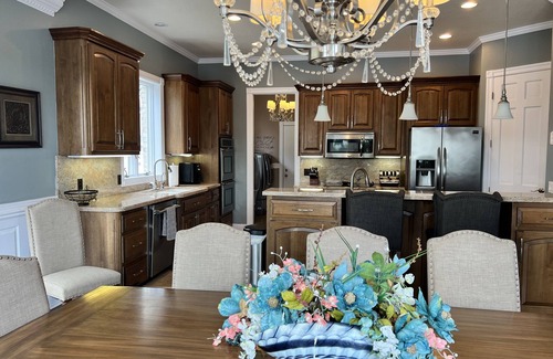 Huge kitchen, spacious for all your guests. Relax on the 1100 square-foot top deck with seating and entertaining space for all. Or go down to the walkout level twin resort feeling magical outdoor space. Double sided fireplace, outdoor TV, infrared heaters Built in. Outdoor dining room table, gourmet gas grill and outdoor refrigerator. Step inside the basement walk out level And see a brand new remodeled living space featuring foosball and ping-pong table. Resort style indoor gym. Wet bar and fridge downstairs for all those late night snacks.