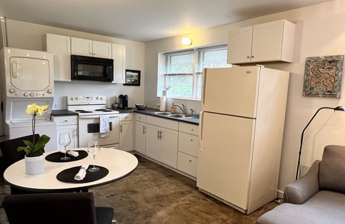 This newly renovated studio apartment is located on the first floor of a city home in the heart of Downtown Charlottesville, just 4 blocks to the Downtown Mall, coffee shops, restaurants and businesses. The home is just 2 miles from UVa, and the John Warner Parkway is right out front, great for biking and walking. The light-filled apartment includes 600 SF featuring a queen bed, a private entrance, ample street parking, and a private patio. Enjoy the open floor plan with a full size kitchen and a full bathroom with walk-in shower among other amenities such as an in-unit washer/dryer, included utilities as well as TV antenna and high speed Ting internet.