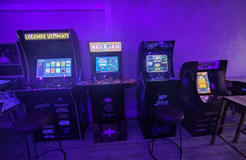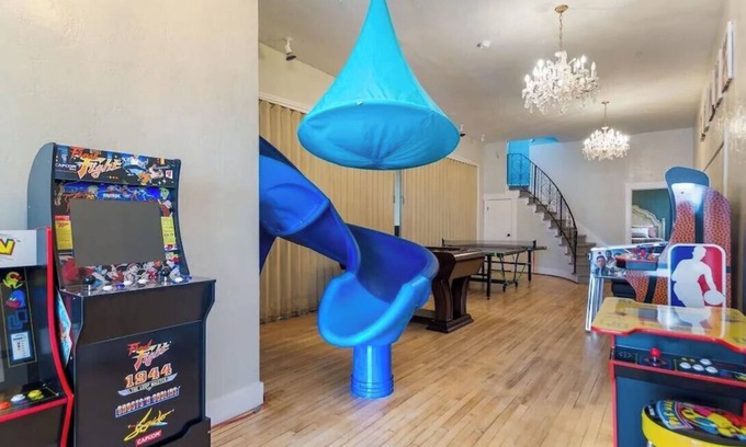 *THE ARCADE ROOM boasts a variety of classic arcade machines, a lively ping pong table, and an exciting foosball table. Additionally, there's a clubhouse accessible via a 5-foot climbing wall. Once inside, kids can relax in comfy bean bags or take a thrilling ride down the twirl slide!