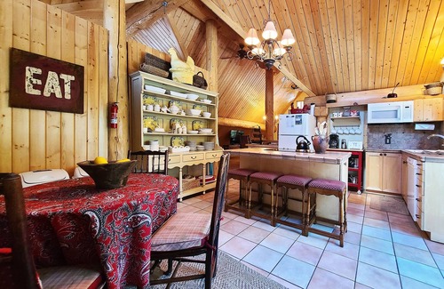 The guest house above the garage features a good-sized living space, a partial kitchen, a table for games, a small dining area, 2 more bedrooms, each with a queen-size bed, and 1 full bathroom with a shower stall in the common area. The dining room table can comfortably seat 4 people, and there's also a television with cable, DVD and VCR players, gas woodstove, and a deck with a table and chairs (summer months only).