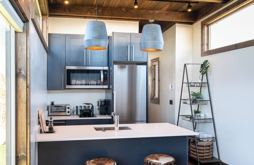 This charming cabin has everything you need for a comfortable and relaxing stay. The tiny house sleeps up to four guests with a queen bed in the bedroom, which you can close off with a sliding door. The living area is cozy and inviting, with a queen-size pullout sleeping sofa and a fireplace to keep you warm on chilly nights.