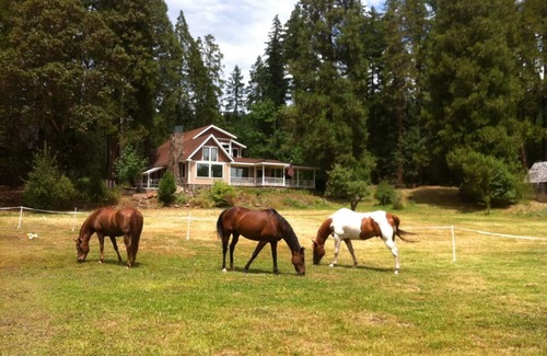 OUTSIDE. Just outside the front door, guests will find the entrance to the “pinecone trail” which leads up a small hill to a secluded sanctuary perfect for star-gazing (the night skies are magnificent!) or side-by-side hammock-style relaxation, and a cozy camp-fire pit. It's a very short walk back to the house if you decide to spread out your tablecloth for a romantic picnic on the knoll. At summer end, the ranch berry bushes are available to guests in abundance. Pick enough for your special treat of sweet wild blackberries when in season.