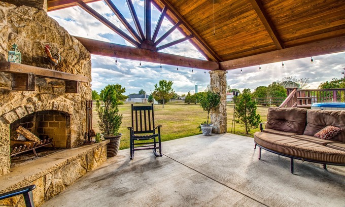 Furnished home on 1 acre with outdoor living and a hot tub! Country feel with city conveniences, just 7 miles to Historic Downtown McKinney. Outdoor living area includes stone wood-burning fireplace with cedar mantle. Kitchen features custom cabinets, granite countertops, hardwood floors. Private master suite with king-sized bed, walk-in closet, granite countertops, framed mirrors, oversized master shower with frameless glass. 2nd bedroom with a king bed, 3rd bedroom with two twin xl beds that each have an adjustable base, and a daybed with trundle in the study can sleep two more. Wood front door, new 2019 carpet and paint, all appliances including refrigerator washer and dryer. Sleeps 8 peoople comfortably
