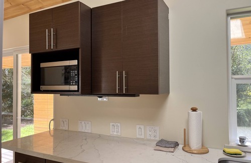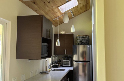 Quiet and private, this cute new cabin opens to a pastoral scene with a rippling stream and wildlife habitat trails. It has a fantastic sound system inside and a complete kitchen to enjoy. Within walking distance is a Town Center for all our needs plus entertainment. This cabin is a hideaway from the bustle, yet a convenient location for all your sightseeing.