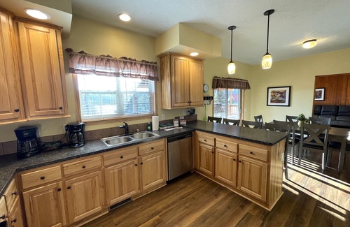 The first floor offers three large bedrooms - all with king size beds. Each comes with a TV; the master bedroom also has a suite retreat master bath that includes a whirlpool tub and fire place. The large modern kitchen includes rustic hickory cabinets for storage and a large island for extra seating and/or food preparation. The adjacent dining room opens to the great room which is furnished with a love seat, sofa bed for additional sleeping accommodations, and a flat-screen TV.