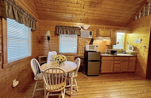 Efficiency style kitchen includes full size refrigerator, build in cook top, microwave, toaster oven, coffee maker, cookware and dishes. The bathroom is fully stocked with fresh linens and a hair dryer. The cabin is air conditioned with ceiling fans and cathedral ceilings, heat, gas log fireplace keeps the cabin warm and cozy on chilly nights. The living room includes Smart TV for streaming and WIFI.