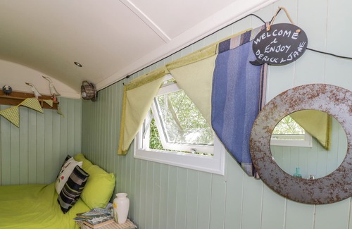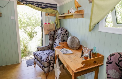 This shepherd's hut has a studio-style layout with a double bed and dining area for two guests. The shared, external facilities consist of two shower cubicles and a kitchen/diner with a two-ring gas hob, microwave, and fridge. Outside, there is a private garden with furniture and fire pit, a shared patio with furniture and barbecue, and ample off-road parking. Within 2.9 miles, there is a shop, and within 1.8, a pub. One well-behaved pet is welcome. Smoking is not permitted. There is 4G available in the hut and WiFi in communal areas only. Power, bed linen and towels are all included in the price. Note: Dogs not allowed on bed. Note: No children. Meadow View is a romantic shepherds hut in Shropshire for two to enjoy the countryside. Note: The pods are well insulated and do not have any heating source