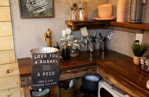 Enjoy the farmhouse rustic design accompanied by high-end amenities that spread across this cozy home. This Tiny House screams romance and we intentionally kept it tiny with TONS of outdoor amenities to immerse yourself in the outdoors. But don't worry- we provide all the amenities indoors as well.