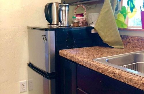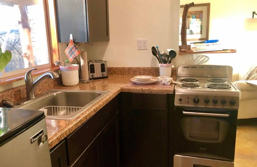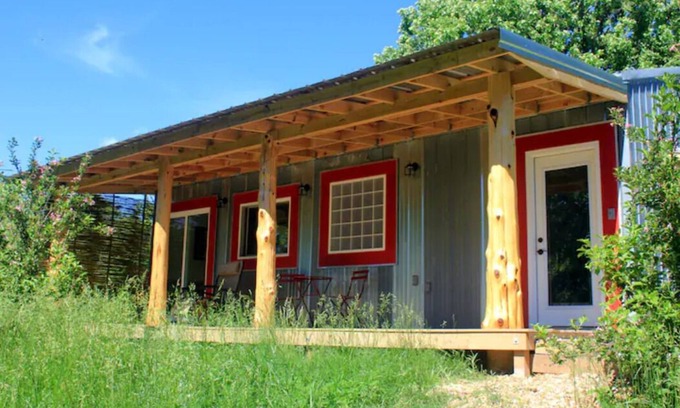 Retreat House #2 is our newest addition . Although smaller than Retreat House #1, it offers even greater seclusion. For a Retreat with all the amenities of a modern home, (except TV and Wi-Fi.) We are close to Eureka Springs but nestled in Nature. This house is attached to a barn. It has one bedroom, full kitchen, bath with composting toilet, heat, AC, a huge chill-out covered porch and access to the walking trail of the OM Sanctuary.