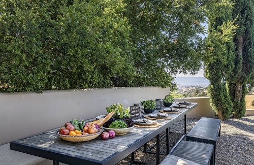 With contemporary Mediterranean design, Rancho Maroma is a five bedroom architectural masterpiece built by noted vineyard architect, Robert Mehl. This vacation home is situated on a hilltop overlooking the entire Santa Ynez Valley, the serene 270-degree views simply take your breath away. Relax in luxury in the beautiful courtyard next to the fireplace or sunbathe by the pool and hot tub. Either way, you will surely enjoy every minute spent at this completely private estate.