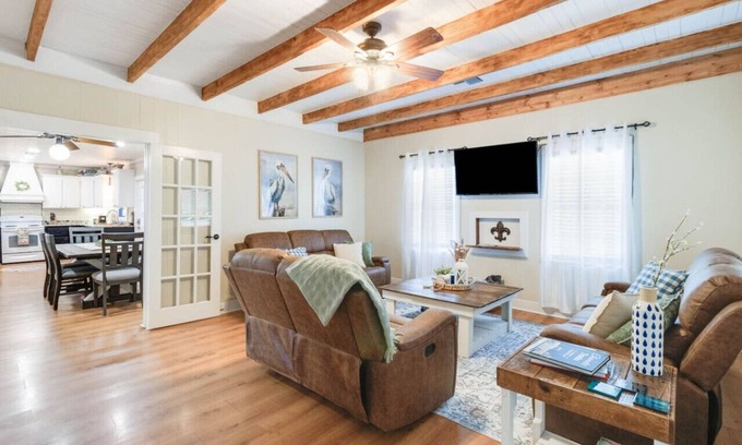 As you step inside, you’ll enter the spacious kitchen and dining area, perfect for cooking and gathering. The fully equipped kitchen makes meal prep easy, while the large dining table is ideal for enjoying those home-cooked meals. Unwind in the cozy living area with three comfy couches and a large TV, perfect for streaming your favorite shows. The house features three bedrooms: two with king beds and one with two bunk beds. Outside, enjoy a view of the pond, pick pecans and limes in season, and relax by the fire pit or watch the sunset from the back patio. Cornhole and board games offer fun for all ages!