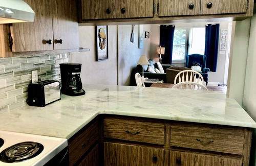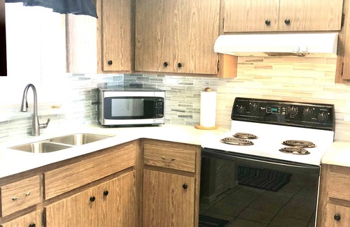 The kitchen contains a full size stove and refrigerator. a microwave, toaster and coffee maker plus all dishes, silverware, cooking utensils and cookware. Bed linens, pillows, towels and washcloths are also provided.