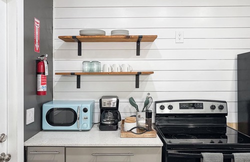 The well-equipped kitchen boasts contemporary appliances, including a refrigerator, stove, microwave, kettle, blender, & coffee maker, making it easy to prepare meals & snacks.