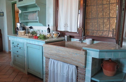 On the ground floor you'll find a very well-equipped kitchen, with a fireplace and a wood- burning stove in addition to a gas stove; a dishwasher, two separate sinks, a coffee machine, a microwave and a big oven. There is a very hospitable and luminous living room with a fireplace. The room opens on to the terrace, an ideal place for enjoying a glass of wine in front of a magnificent sunset, something unforgettable.