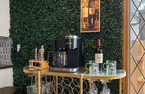 Our kitchen boasts stone countertops and all the essentials for cooking, brewing a cup of coffee, or mixing up a cocktail. And of course, there's no shortage of wine glasses for your enjoyment.