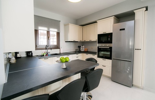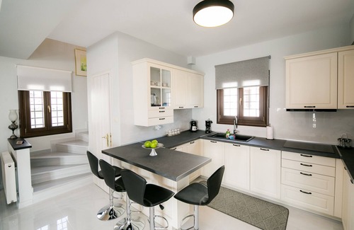 The dining area offers table seating for 6 with additional seats at the kitchen counter. The house floors are paved with marble or wood like ceramic tiles and in the interior high-end comfortable and family friendly furniture and decor have been placed. A complete kitchen is provided with all the cooking utensils.