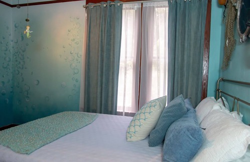 The Mermaid room will be sure to please anyone who dreams of being a mermaid or under the sea. This room is themed after the longest running mermaid show in the US located a short drive away from OMHouse at Weeki Wachi Springs.