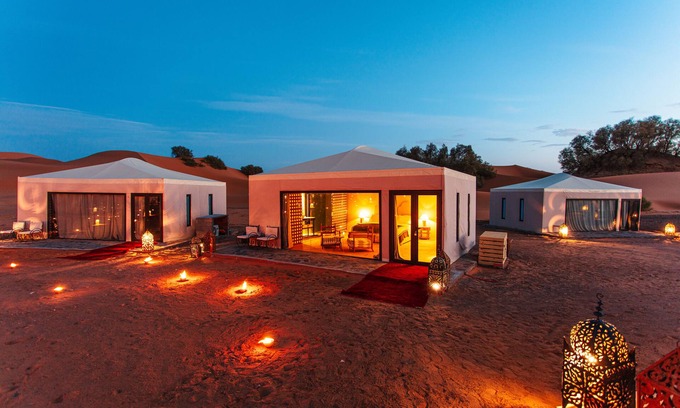 Best-rates for the Merzouga Luxury Desert Camps starts from $448 per night with includes Toiletries, Entertainment, Breakfast, Air Conditioner, Security/Safety, Bedding/Linens, Bar, Guest Services, Child Friendly, Parking, Balcony/Terrace, Restaurant with all other amenities. Perfect for Weddings is committed to ensuring every guest experiences a comfortable and extraordinary stay, whether planning a romantic getaway, a honeymoon, a pet-friendly stay, or celebrating with the entire wedding party.
