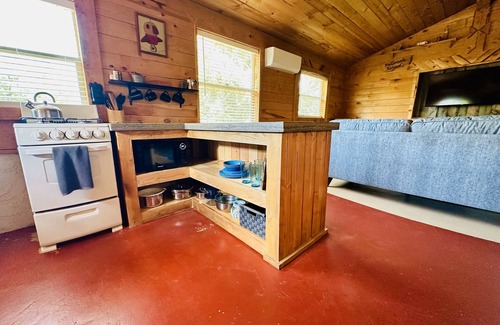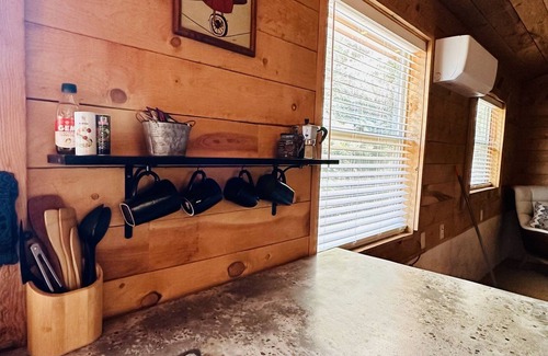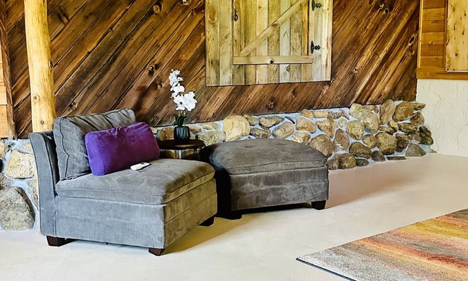Rustic bohemian-style cabin featuring exposed rock and wood walls, concrete floors, and a carefully curated mix of new and antique decor and furniture. The cabin is surrounded by mesquite bosque and desert scenery and provides a private setting for relaxation and solitude.