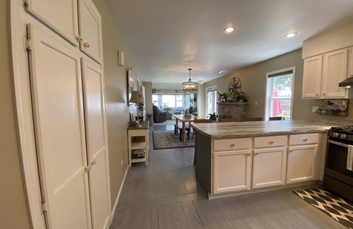 Our 1.5 story home has new central air, natural gas forced air heat, a fully stocked kitchen & pantry including all new appliances and a dishwasher. First floor open concept includes entry off the attached garage; laundry room with washing machine and dryer for your use; full bathroom including toilet, tub and shower; large kitchen includes breakfast bar which seats 4 and opens up to the dining room and the lovingly handmade Montana cedar table which seats 6; cozy living room with windows on 3 sides with spectacular views of the lake; Master Bedroom with walk-in closet. Door leading out from dining room/living room opens onto beautifully landscaped patio with table & 4 chairs, chaise lounge, and 2-person swing to enjoy Southern exposure sun with your morning coffee or evening cocktails or just to sit and cool off with the wonderful breezes off the lake!