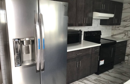 2- New full kitchen: high end, custom cabinetry with quartz countertops & full backsplash, dual white porcelain kitchen sink, kitchen faucets, electrical GFCI plugs new LG fridge, GE dishwasher, Frigidaire electric stove, garbage disposal, trash/recycling cans, water filter system (our unit is in a city water/city sewer platform).