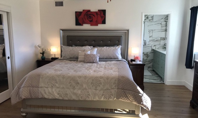 Our 2 Bedroom House is for a home-away-home, vacation home, or corporate housing. Our master bedroom has a CA King Size bed, & the orthopedic Copper Sport Hybrid Mattress. It has full kitchen (Large LG Refrigerator, Microwave, Garbage Disposal, Dishwasher, Electric Stove, water filter), dining room (dining table with bench, can seat 6 people), laundry area (electric washer & dryer in unit), WIFI, free parking (2 cars space, more parking space available in the street), Electric fireplace, Large 55" screen SMART TVs in each bedroom, & 82" QLED Smart TV in the living room, comfortable sectional sofa which can be converted in a bed for 2 people . A charm escaping for the business people, athletes, medical doctors & nurses, leaders & entrepreneurs who are involved with their customers, partners, contractors or their offices in the South California area.