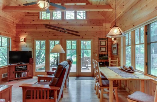 Enjoy the river view over breakfast or while preparing an intimate meal in the fully equipped kitchen. Slab granite countertops and stainless appliances bring an unexpected level of sophistication for your cabin experience while the graceful river setting provides the ultimate getaway.