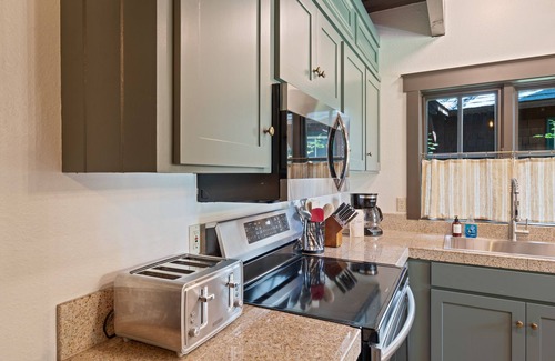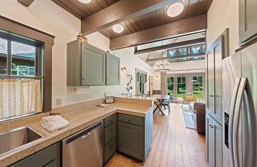 The kitchen, though compact, is fully equipped with modern appliances and a farmhouse sink, making meal prep a delight. Enjoy your creations at the dining table placed by the windows, offering scenic views of the river while you eat.
