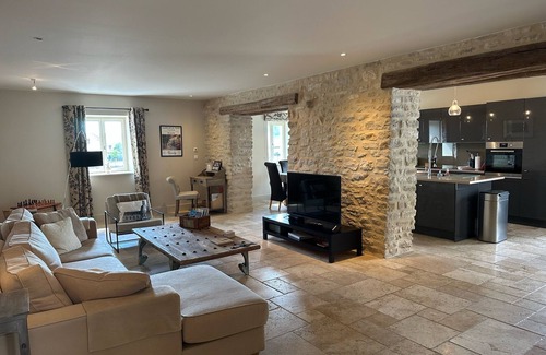 Living: the open plan living accommodation is downstairs, a extremely spacious. Renovated stone and original oak beams mix with relaxed modern colours, comfortable sofas, large HD TV with satellite channels and lots of wine books and novels.