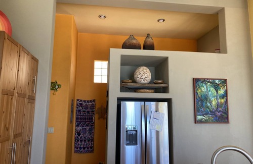 If you like to cook like we do, this is the place to do it. Our well stocked kitchen has all of the appropriate utensils, knives, pots & pans, and small appliances to prepare anything possible. (If you don't like to cook, just call one of the many caterers for a delicious, reasonably priced Mexican buffet! The abundance of fresh fish from the Sea is amazing..) Just steps from the 8' island (with bar stools)is a propane, stainless steel barbeque. It is plumbed directly into the propane tank (no small bottles to run out during cooking!). Adjacent to this is another, outdoor bar that seats 6, and a large sunken, cushioned beach-wood burning fire pit. Our unique stainless steel, glass topped dining table seats 6-8 people.