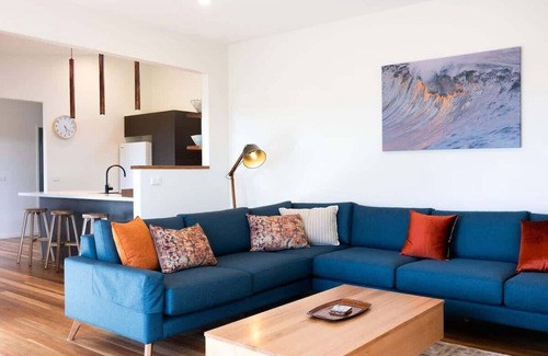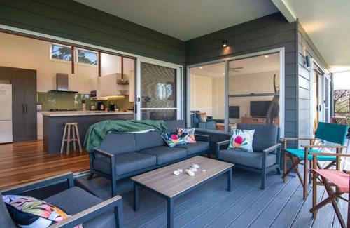 From the moment you step through the doors of Mherringa, the home's welcoming, luxurious and airy atmosphere is experienced with north facing sliding doors opening onto beautiful ocean vistas. Created with families in mind, the architectural design has multiple living zones to suit your needs. Guests enjoy their own space upstairs with living, dining and kitchen, and a master bedroom with ensuite. The second bedroom is on a mezzanine with a separate bathroom and toilet. More family space downstairs comprises a bedroom with four bunks and a second lounge space or fourth bedroom with a queen sofa bed, TV, DVD, and games.