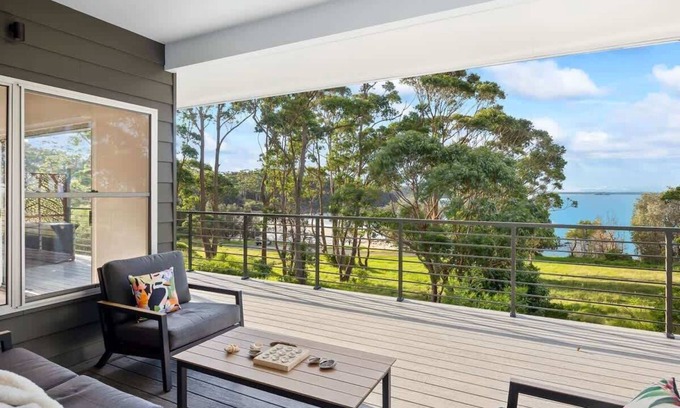 New Bawley Point luxury home with panoramic views from the wraparound balcony overlooking the beach to headlands north. Walk minutes to Bawley Beach, to the Gantry for fishing and snorkelling, and a short walk to Willinga Lake and Cormorant Beach.