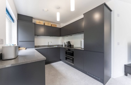 The kitchen is fully equipped and stocked with all of the appliances and amenities you'd find at home including a full-size dishwasher, washing machine, tumble drier, induction hob and electric double oven with plenty of room for your self-catering holiday groceries. The dining area with a table and 4 chairs make a great space for you to relax and chat with other members of your group whilst cooking and is perfect for your group to dine together after a hard day exploring the local area.