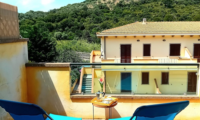 New and lovely penthouse with double exposure, 1 double bedroom with balcony and view on the mountain, 1 bathroom, living room with kitchenette, comfortable double sofa bed and panoramic terrace overlooking the mountain and the sea of the beautiful Gulf of Asinara (the island of Asinara is part of the National park, a protected marine area). Located a few steps from the marina it's perfect for those who own boats, for fishing enthusiasts or for those who love sailing, a few steps from the Marina beach and the town center (400 meters) and not far from the beautiful beach of Lu Bagnu (950 mt)...