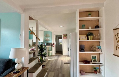Our beachy cottage features two full-sized beds and a queen-sized bed across two stories, providing ample space for everyone. The loft-style design enhances the airy, open feel of the home, making it a perfect setting for a relaxing stay. Living, dining and bathroom is located on the first floor and the sleeping area is located on the second floor. The dining area includes seating for six, ideal for family meals or gatherings. Please note, there is a narrow steep staircase original to our quaint shore cottage leading to the sleeping area on the second floor.