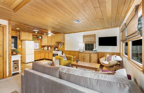 The cozy living room, adorned with a plush couch, is ideal after a long day's hike. Enjoy the well-equipped kitchen with a gas stove and Smeg espresso machine. Unwind with board games or a movie in the cozy basement. Outside, gather around the fire pit to roast marshmallows or stargaze.