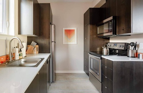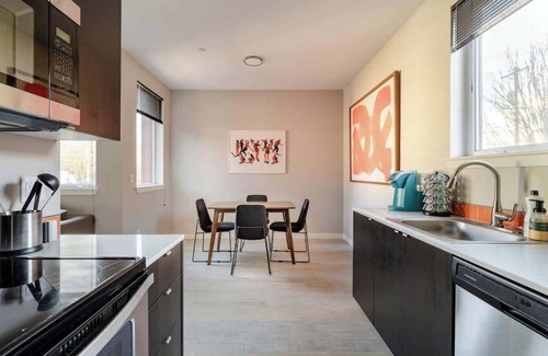 Located in the vibrant Hawthorne District, our apartment is within walking distance of Portland's best restaurants, cafes, bookstores, brewpubs, and distilleries. Services like banks and massage therapists are nearby. About a mile from downtown, you can explore by bike, bus, or on foot. Our sleek, European-style interiors feature high-grade surfaces and finishes, offering comfort and elegance. Note that there may be noise from neighbors; we’re happy to provide earplugs and a noise machine!
